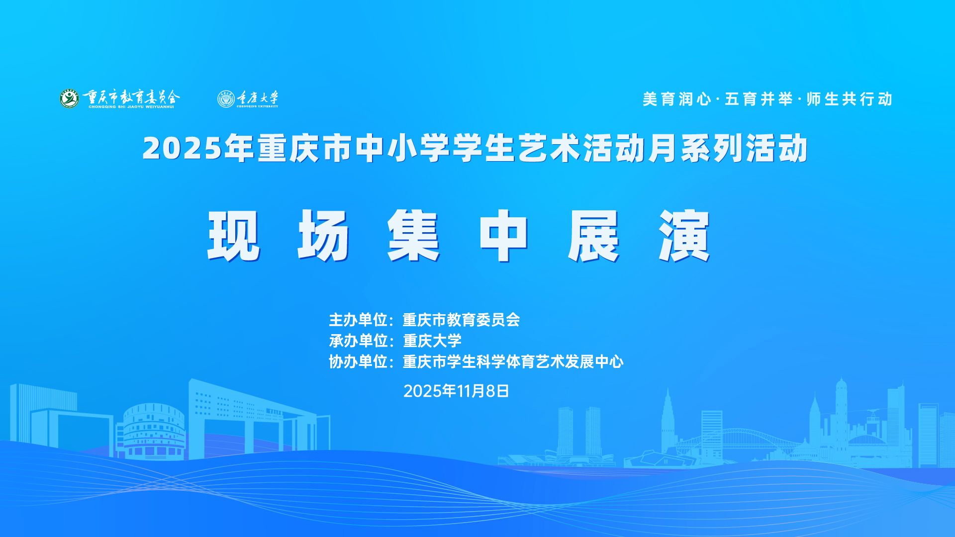 2025年11月8日,由重庆市教育委员会主办、重庆大学承办、重庆市学生科学体育艺术发展中心协办的“2025年重庆市中小学学生艺术活动月系列活动现场集中展演”(以下简称“展演活动”)在重庆大学科学城校区虎溪校园顺利举行。本次展演活动是重庆市中小学学生和美育教师的美育成果共同集中展演,全市所有区县教育行政部门及3000余所中小学校积极参与,是基础教育阶段实施学校美育浸润行动的有利实践。本次展演活动也是重庆市艺术活...