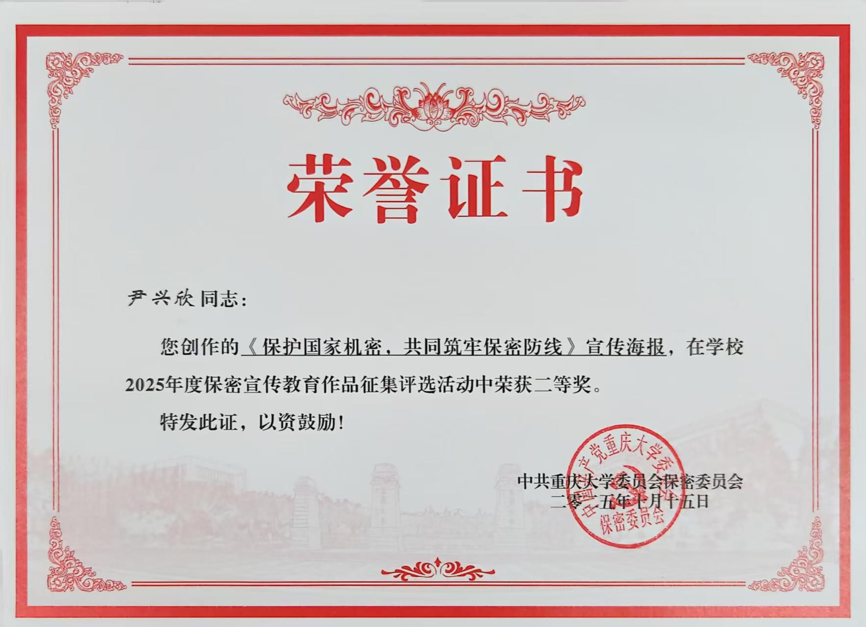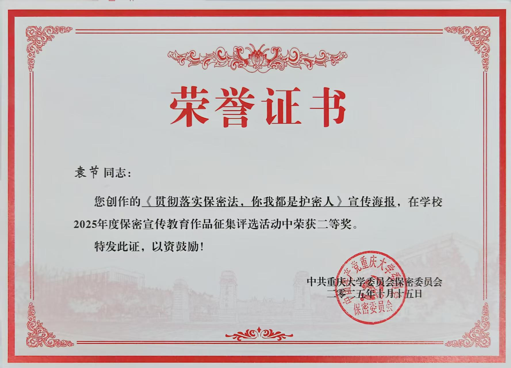 近日,重庆大学保密宣传教育作品征集评选活动结果正式揭晓,艺术学院学子凭借新颖的创作思路与出色的作品呈现,在众多参赛作品中脱颖而出,斩获多项荣誉,共10名同学9件作品获奖,其中一等奖1项、二等奖2项、三等奖4项、优秀奖2项,展现了学院在保密宣传教育工作中的突出成效。