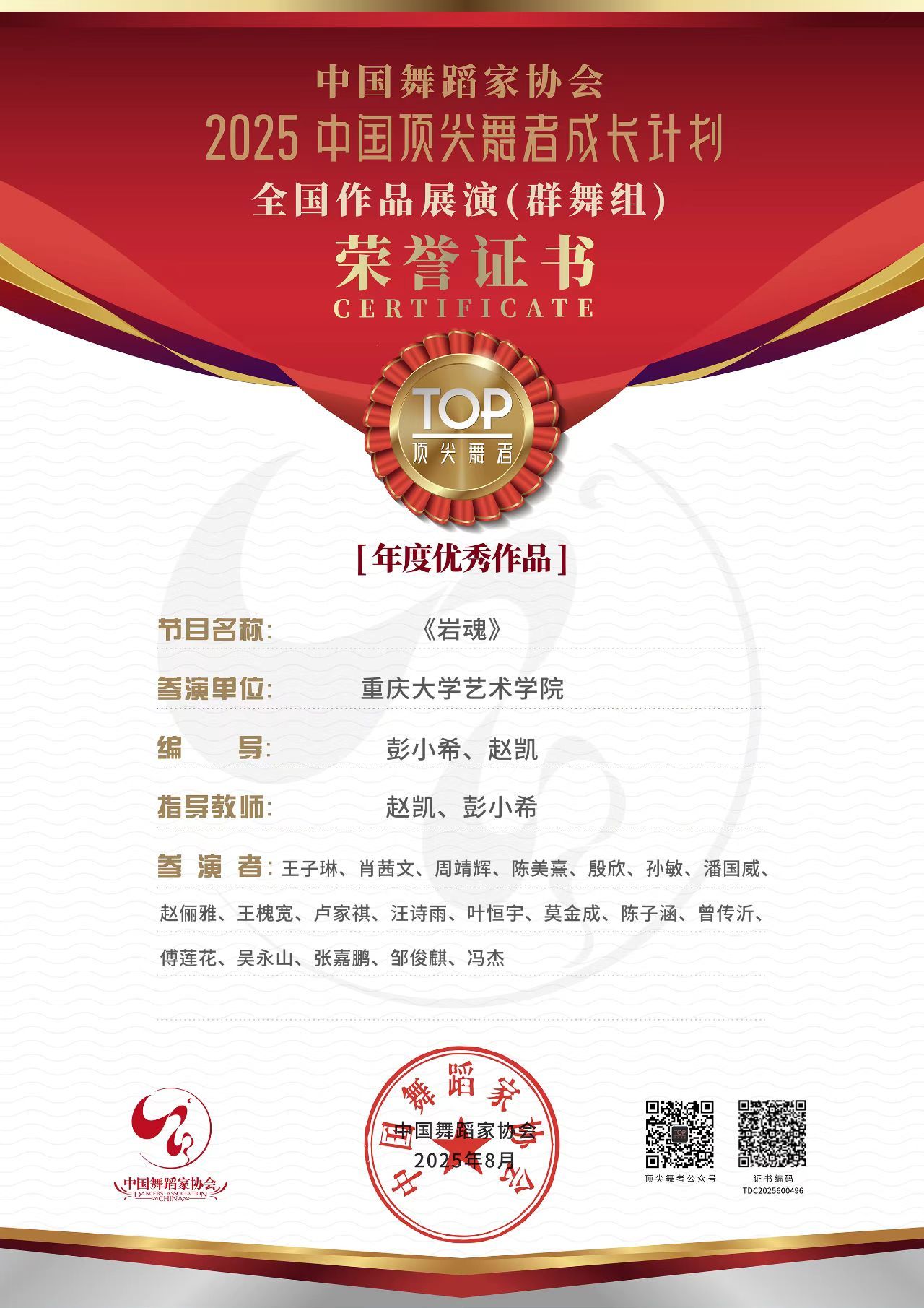 在刚刚公布的“2025中国顶尖舞者成长计划”(群舞组)年度推选结果中,重庆大学艺术学院两部舞蹈作品载誉而归,其中《谁寄锦书来》斩获“年度顶尖作品(群舞组)”,《岩魂》荣获“年度优秀作品(群舞组)”。