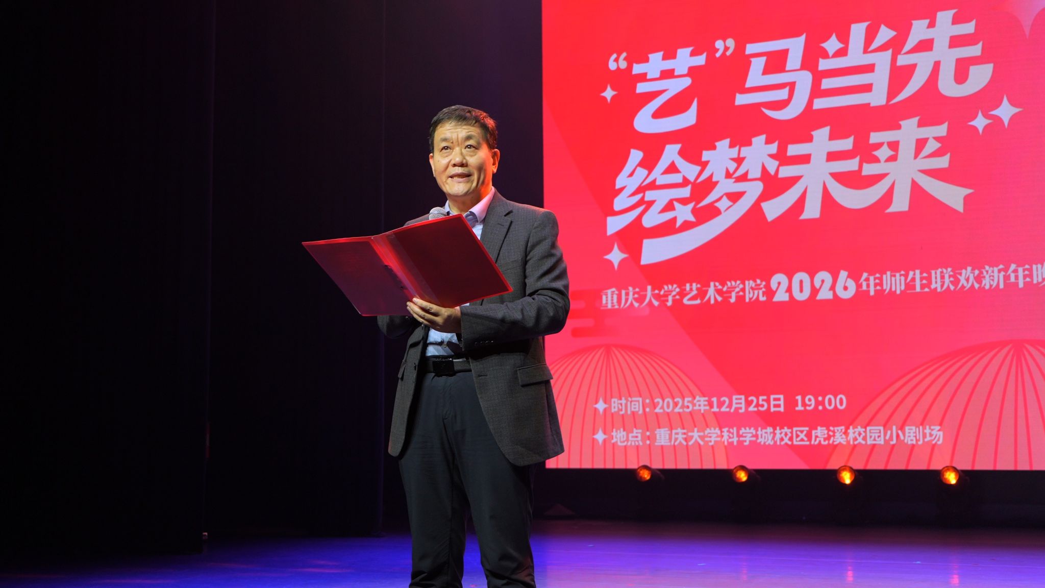 光阴更迭,新章再启。2025年12月25日19:00,重庆大学艺术学院在科学城校区虎溪校园小剧场举办“‘艺’马当先、绘梦未来”2026年师生联欢新年晚会。晚会凝结了学院师生的才情与巧思,展现了学院多元斑斓的文化底色与敢为人先的创新气质。学院党委书记蒋华林、院长张楠木,党委副书记、纪委书记王琦,副院长夏进军、彭小希等领导与400余名师生欢聚一堂,在热闹喜庆的热烈氛围中挥别砥砺深耕的2025,跃马奔向崭新的2026。