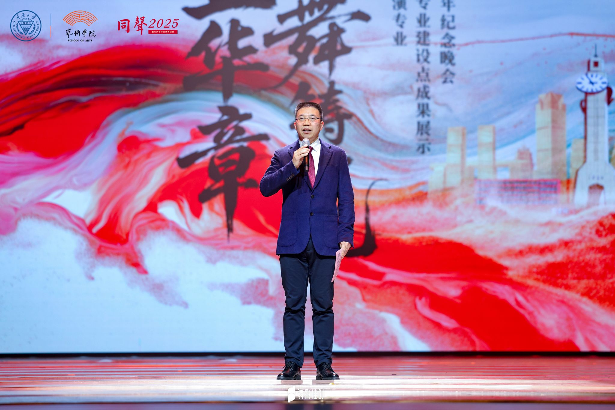 二十五载舞步不辍,新时代华章再启。2026年1月8日晚,“廿五华章·舞铸一流”——重庆大学舞蹈表演专业国家级一流本科专业建设点成果展示暨舞蹈系建系25周年纪念晚会在重庆市劳动人民文化宫影剧院隆重举行。重庆市文学艺术界联合会党组书记、副主席阳奎兴,重庆大学原党委书记祝家麟,重庆大学副校长、人文学部主任饶劲松,以及重庆市教委、市文旅委、市舞协,重庆大学党办校办、党委宣传部、人文学部等职能部处及部分学院有关负责人、师生出席活动,来自全市高校、文艺界的专家、校友和社会各界人士近千人共同观看演出。本次晚会系重庆大学“同声2025”毕业展演系列活动之一,由重庆大学党委宣传部、艺术学院、美育教育中心联合主办,艺术学院舞蹈系全体师生倾情呈现。