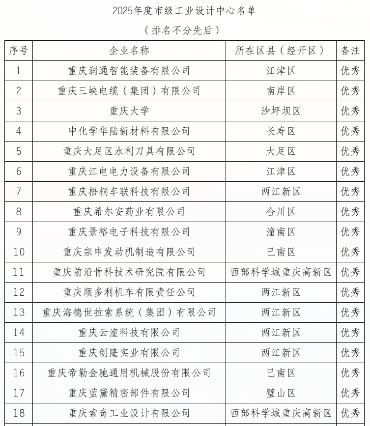 4月9日,重庆市经济和信息化委员会正式发布《关于公布2025年度市级工业设计中心认定及复核名单的通知》。根据通知,经过企业自主申报、区县经信部门推荐、专家评审、现场审查、委党组会审议和网上公示等程序,重庆大学成功入选“2025年度市级工业设计中心名单”,且以“优秀”成绩获评。