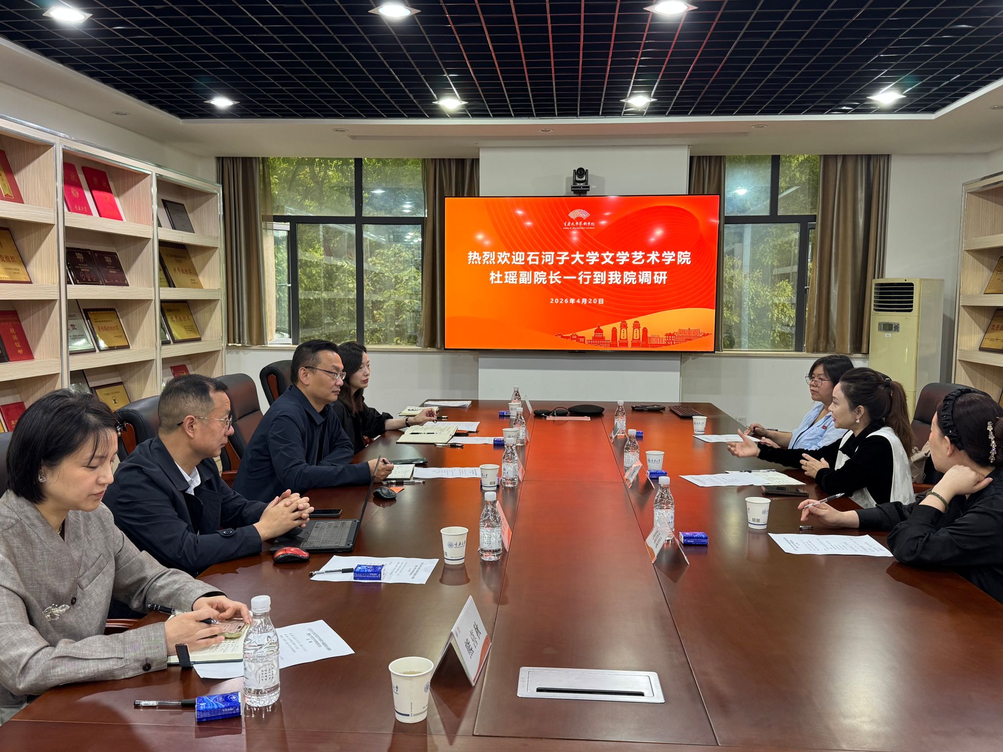2026年4月20日,石河子大学文学艺术学院副院长杜瑶一行到重庆大学艺术学院调研交流。调研交流会由艺术学院副院长夏进军主持。石河子大学文学艺术学院美术与设计系理论教研室主任刘媛媛、美术与设计系环境设计专业负责人舒梅娟,重庆大学艺术学院副院长彭小希、美术学系主任武若尘、设计学系副主任熊喜秋等参加调研座谈。