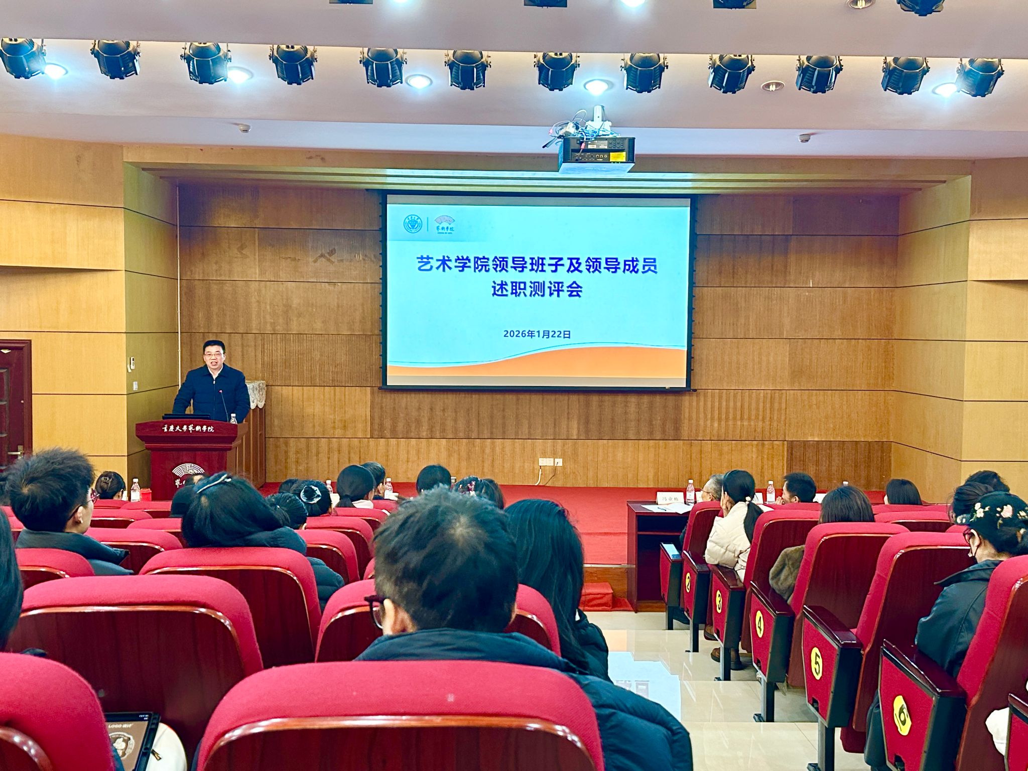 2026年1月22日下午,艺术学院2025年度领导班子及领导成员述职民主测评会在学院办公楼学术报告厅举行。校党委副书记冯业栋出席并讲话,学校党委考核组成员、校党委统战部副部长陈西东及发规处政策研究办公室副主任陈莹到会指导。艺术学院党委书记蒋华林主持会议,院长张楠木等领导班子成员参加会议。学院全体教职工参会。