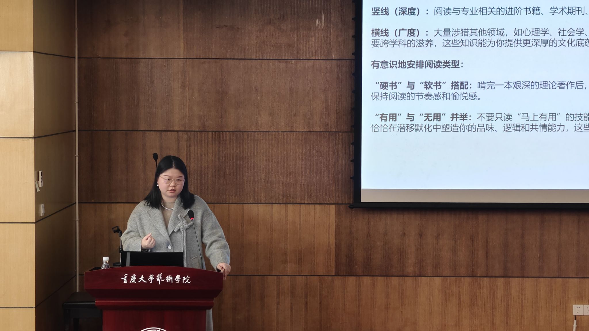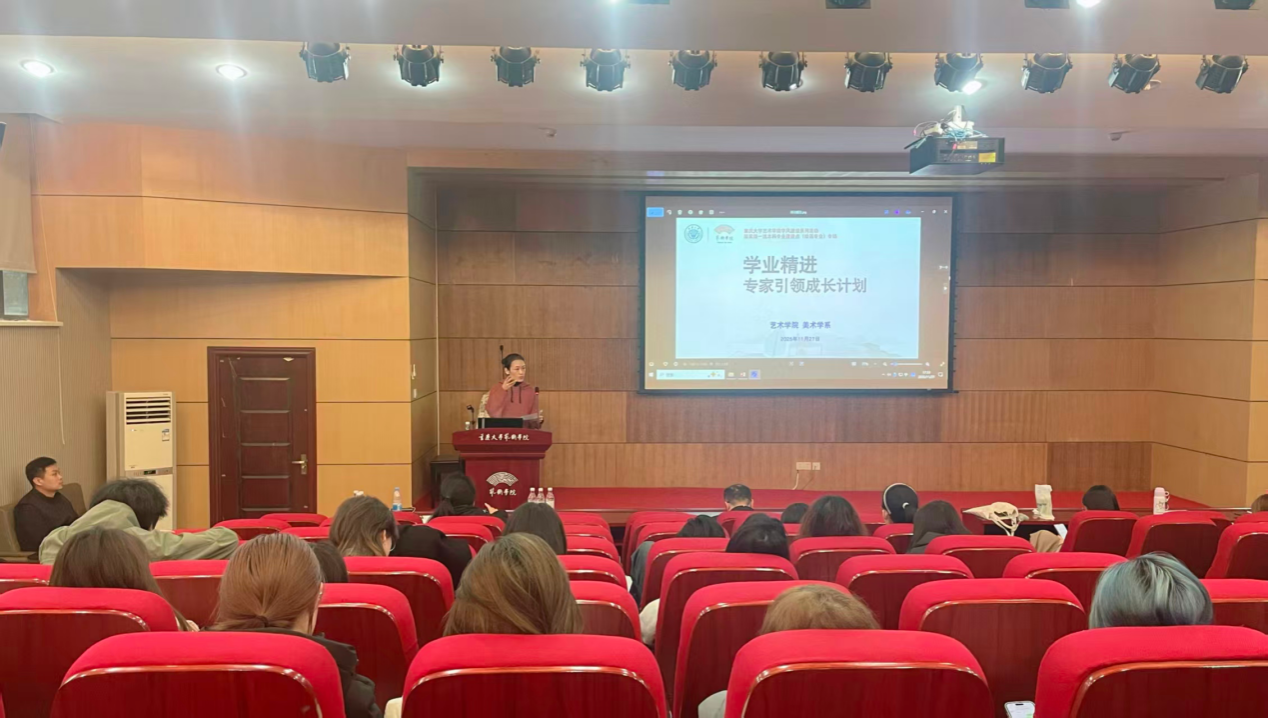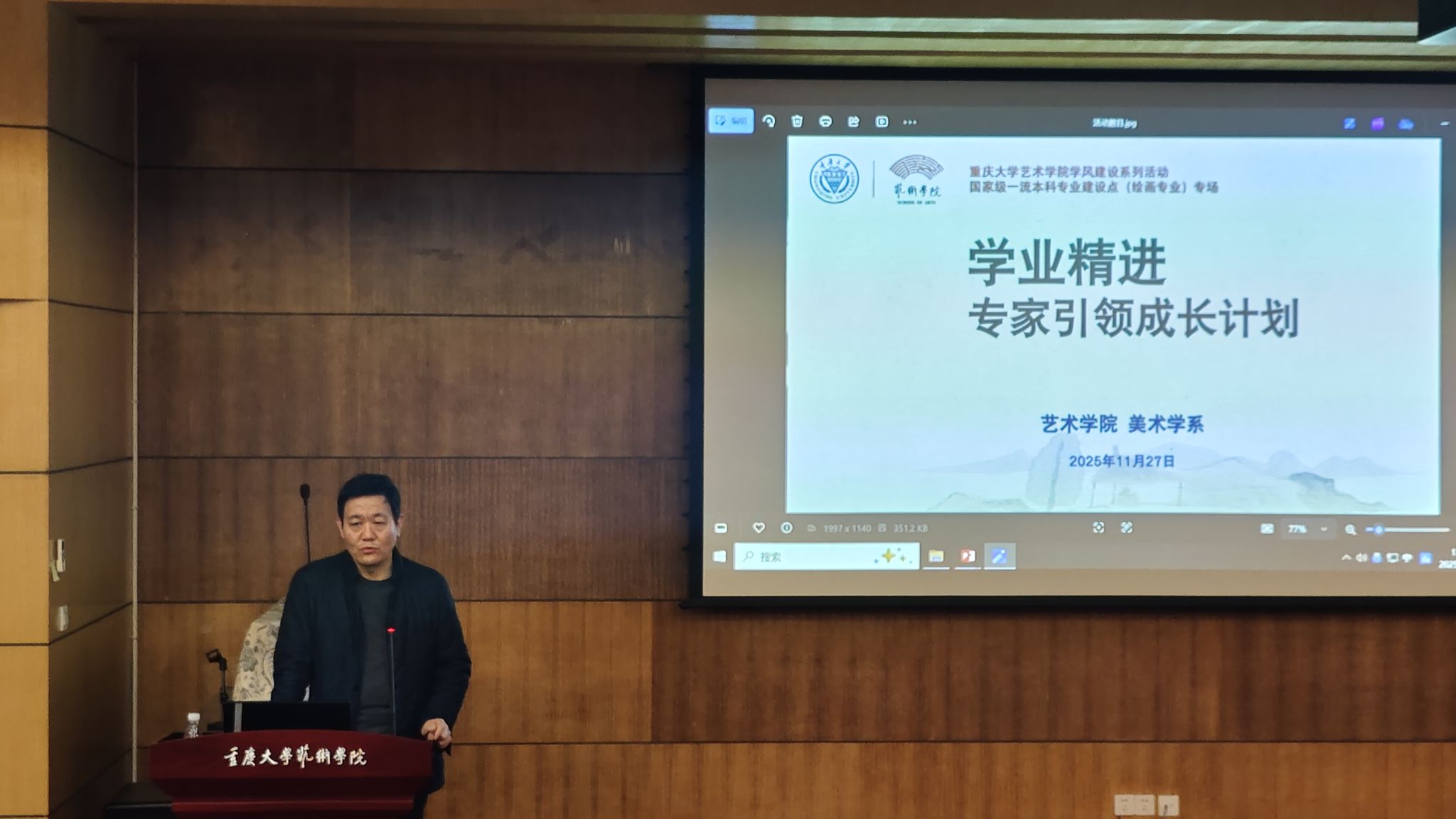 2025年11月27日下午,由重庆大学艺术学院主办、美术学系承办的“学业精进·专家引领成长计划”学风建设活动在学院学术报告厅顺利举行。本次活动由美术学系副主任高源策划,班主任孙天龙、赵颂淳、王汉、黄振联合组织。艺术学院院长张楠木、美术学系教师及各年级学生参加了此次活动,活动由孙天龙主持。